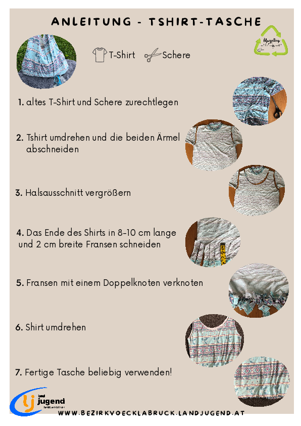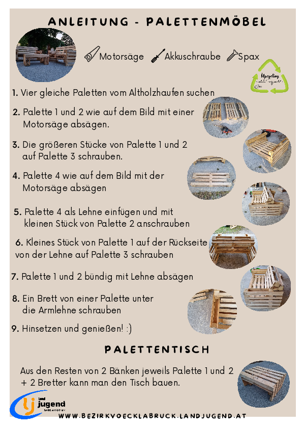 Das Bezirksprojekt besteht aus verschiedenen Veranstaltungen, mit welchen die Bezirkslandjugend die Landjugendlichen aus dem Bezirk für das Thema Upcycling motivieren möchten. Upcycling im Werkunterricht der Volksschule, Schmuck aufwerten, ein Vortrag zum richtigen Recyceln oder Möbel aus alten Paletten bauen werden Teil des Projektes sein. Die Hauptveranstaltung wird die Upcycling-Rallye sein.