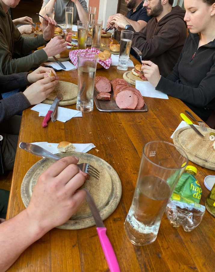 Danach durften wir noch auf der gemütlichen Terrasse des zugehörigen Wirtshauses ihren Leberkäse verkosten.