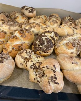Aus dem Teig wurden selber Flesserl geformt und mit Körnern verziert. Nebenbei erklärten wir den Kindern, wie aus dem Weizenkorn Mehl entsteht.